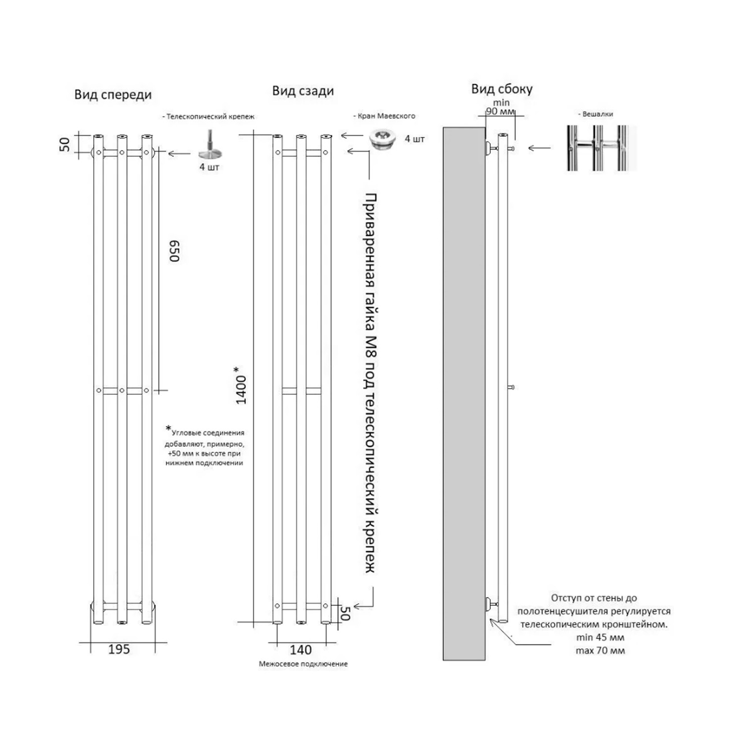 Вертикальный полотенцесушитель оснащен вешалками для удобного размещения полотенец в ванной комнате.