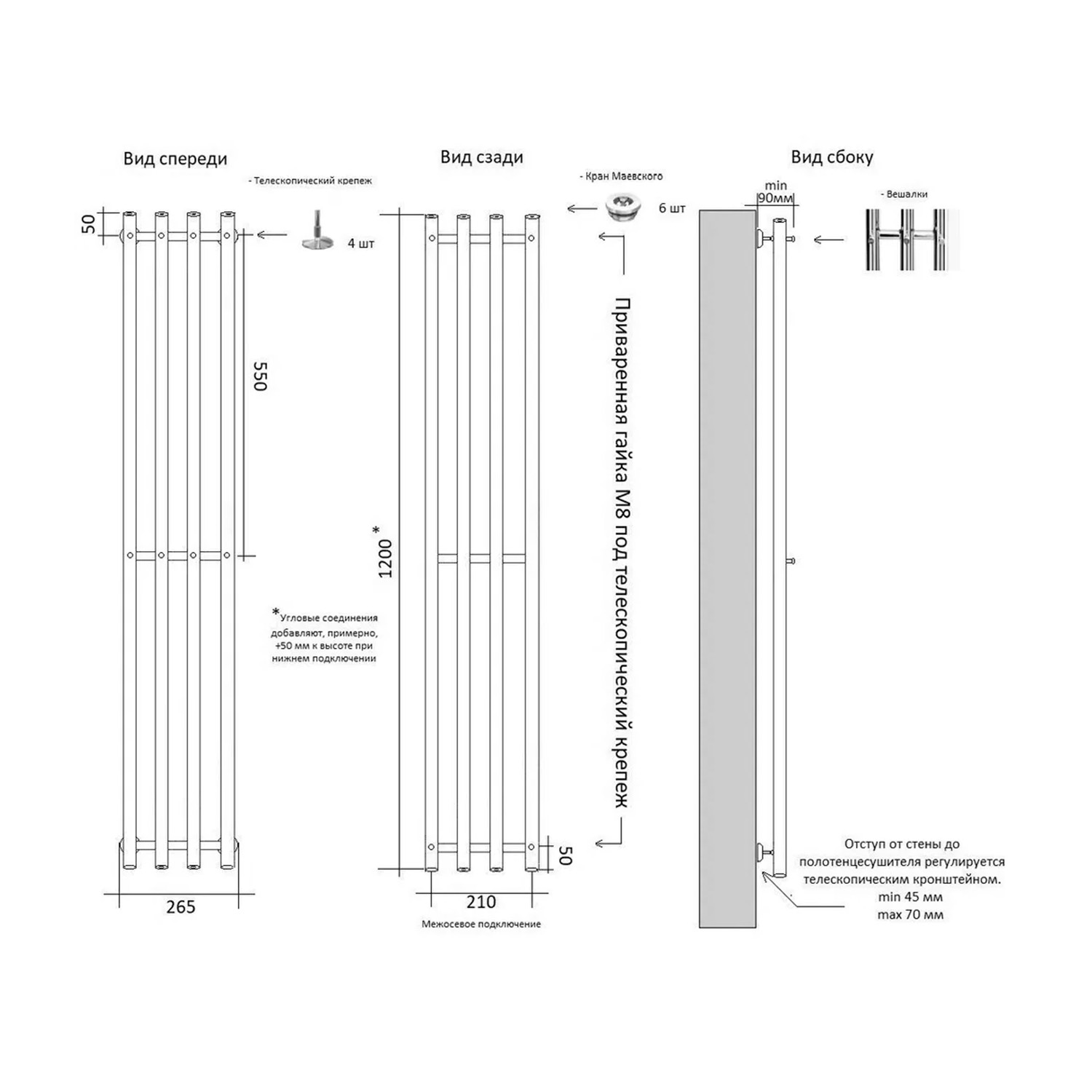 Вертикальный полотенцесушитель оснащен вешалками для удобного размещения полотенец в ванной комнате.